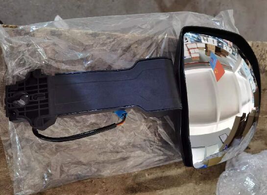 Een compleet, gereed te installeren zijspiegel met behuizing en interne onderdelen.